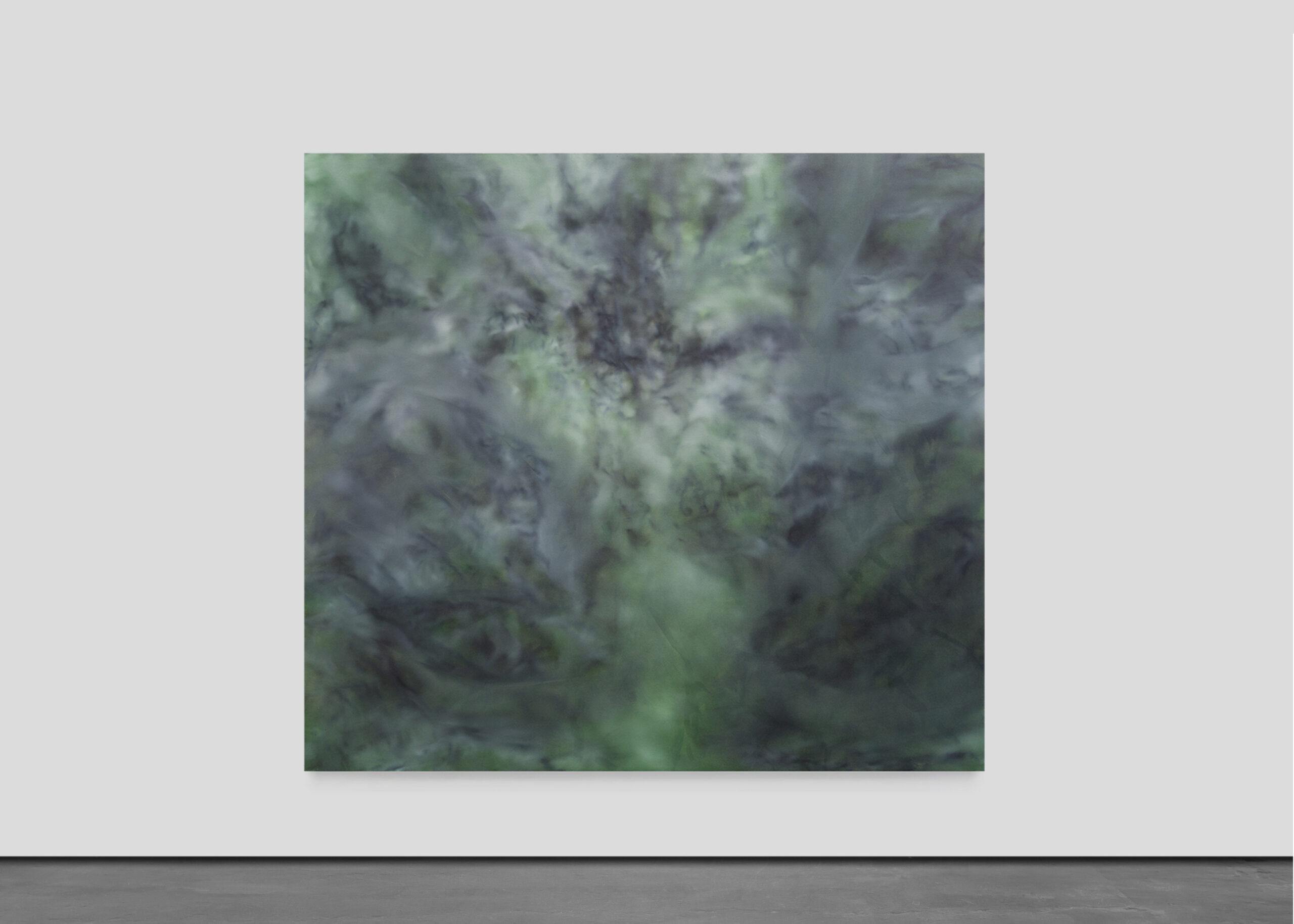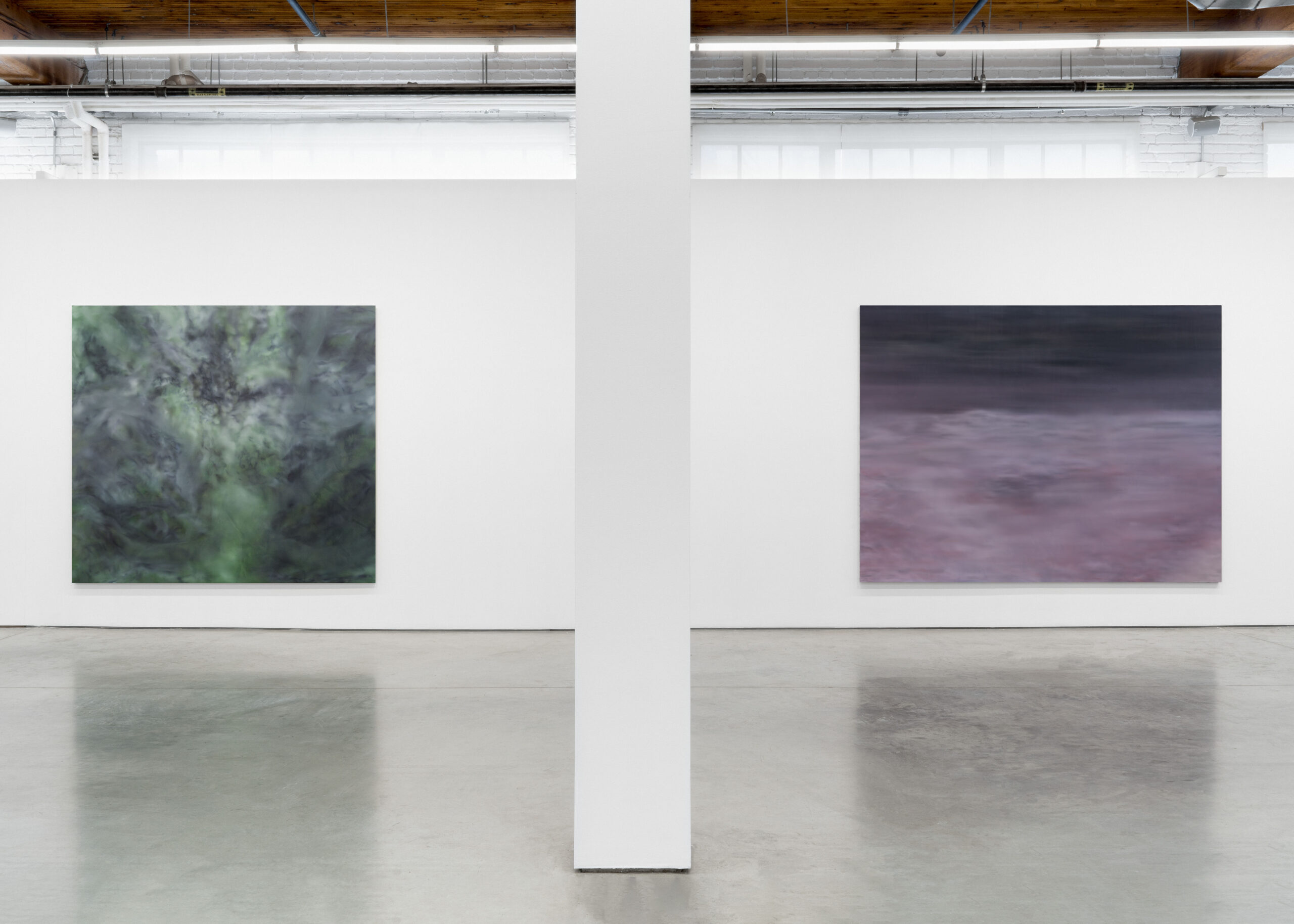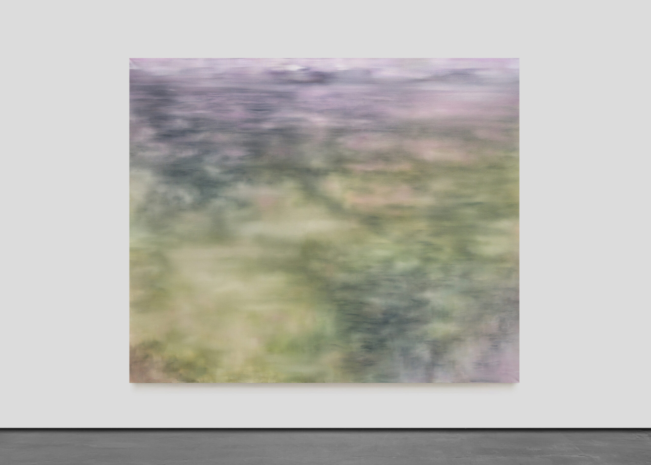 À première vue, les abstractions amorphes et déstructurées de Derviz semblent avoir pris vie sans intervention, comme si elles étaient apparues par enchantement. Pourtant, leur apparence éthérée qui captive au premier abord est le résultat d’innombrables traces superposées, fruit d’une méthode laborieuse et stratégique qui ne fait pas de la visibilité sa priorité. Les images de référence, assemblées intuitivement comme guides discrets pour la composition globale, sont choisies non pas pour leur clarté représentative, mais pour leur capacité à éclairer une scène avant de s’estomper. Les structures sous-jacentes des peintures sont tracées au fusain, puis disparaissent à mesure que les œuvres s’achèvent : Derviz applique plusieurs couches de peinture à l’huile semi-transparente, créant ainsi des mondes sans bornes ni frontières. L’accumulation de ces surfaces translucides structure le tableau tout en laissant place à d’heureux imprévus. De ce terrain mouvant émergent des masses lourdes et des ombres vaporeuses, des formes qui semblent muter en fonction de leur environnement. Derviz maîtrise toute une gamme d’effets atmosphériques, produisant une coexistence désorientante entre lourdeur et légèreté.